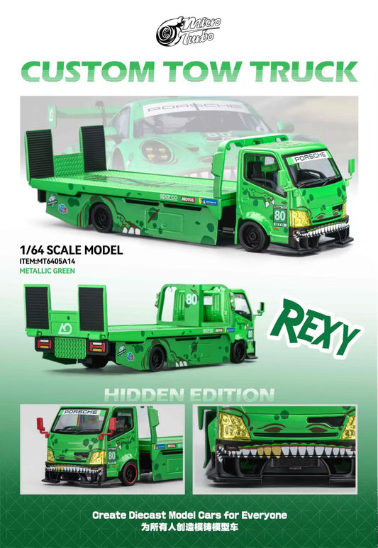 Micro Turbo 1:64 Mega Gear Hino 300 Series MK2 Custom Extendable Tow Truck Flatbed Livery Tyrannosaurus Rexy Metallic Green (Chance of a Chase Car)