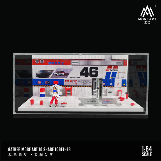 MoreArt 1/64 Automobile Repair Workshop Garage Diorama with Tools and Figure Set- BRE Datsun Edition