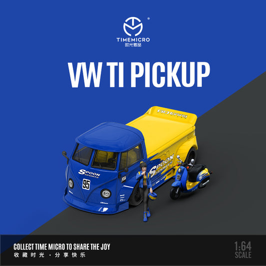 Time Micro 1/64 Volkswagen Kombi T1 Modified Wide Body Pick-Up Truck SPOON Edition + Retro Scooter + Model Girl Figure Full Set