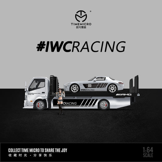 Time Micro 1/64 Hino H300 Flat bed Transport Trailer Truck Extendable Flat Bed IWC Racing Edition + Mercedes-Benz SLS + Model Girl Figure Full Set