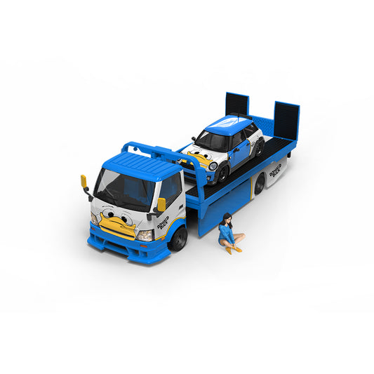 Time Micro 1/64 Hino H300 Flat bed Transport Trailer Truck Extendable Flat Bed Disney Donald Duck Edition + Mini Cooper + Model Girl Figure Full Set