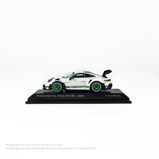 MINICHAMPS 1:64 PORSCHE 911 (992) GT3 RS - 2024 - WHITE W GREEN DECOR EXCLUSIVE FOR CLDC