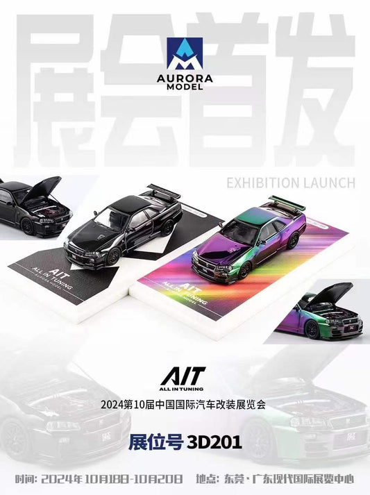 Aurora Model 1:64 Nissan Skyline GT-R R34 Z-Tune Chrome Black Openable Front and Rear Hoods China All In Tuning Expo 2024 Limited Edition 499 Pieces