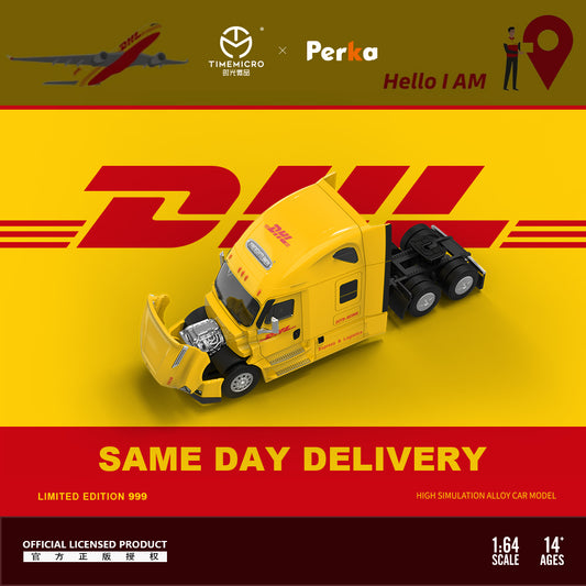 Time Micro x Perka 1:64 Freightliner Truck Same Day Delivery Openable Engine Hood DHL Edition