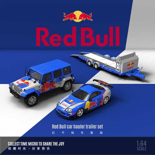 Time Micro 1/64 Car Hauler Trailer Set Red Bull Edition - Toyota Supra A80Z & Jeep Rubicon & Trailer