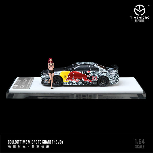Time Micro 1:64 Nissan Skyline GT-R34 Red Bull Camouflage Edition Openable Engine Hood with Model Girl Figure