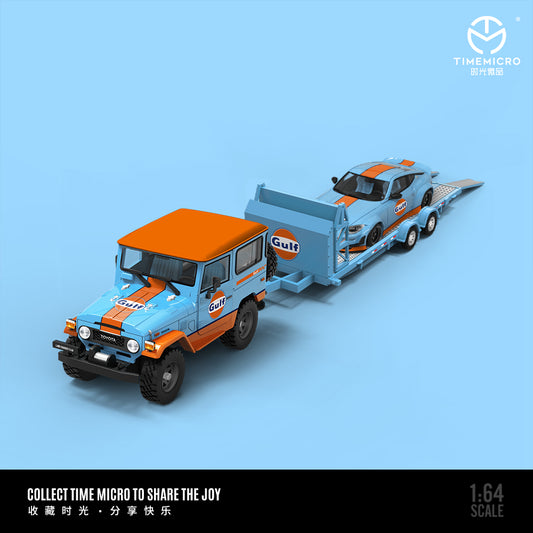 Time Micro 1/64 Car Hauler Trailer Set Gulf Edition - Toyota Land Cruiser FJ40 & Nissan Fairlady 400Z & Trailer